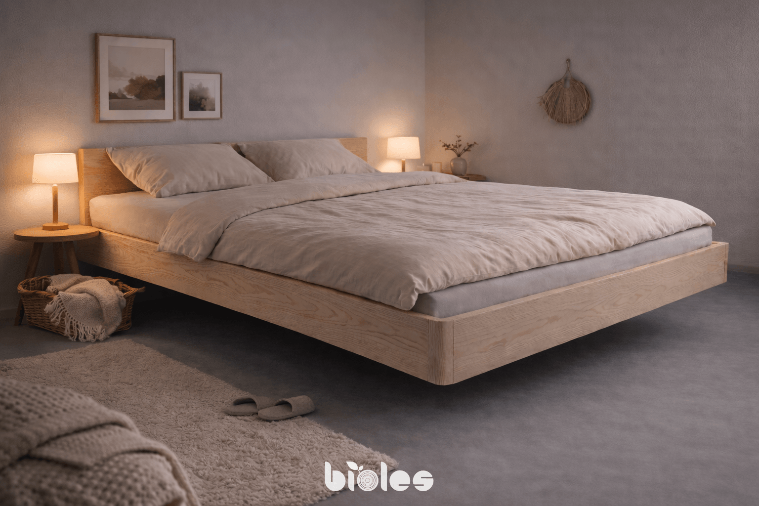 Dieses äußerst beliebte schwebende Bett aus 100 % massiver Esche vereint minimalistisches Design, erstklassige Handwerkskunst und höchste Alltagstauglichkeit. Durch die intelligente Konstruktion wirkt das Bett optisch schwebend, während ein sehr stabiles, verborgenes Untergestell für außergewöhnliche Festigkeit und Langlebigkeit sorgt.
