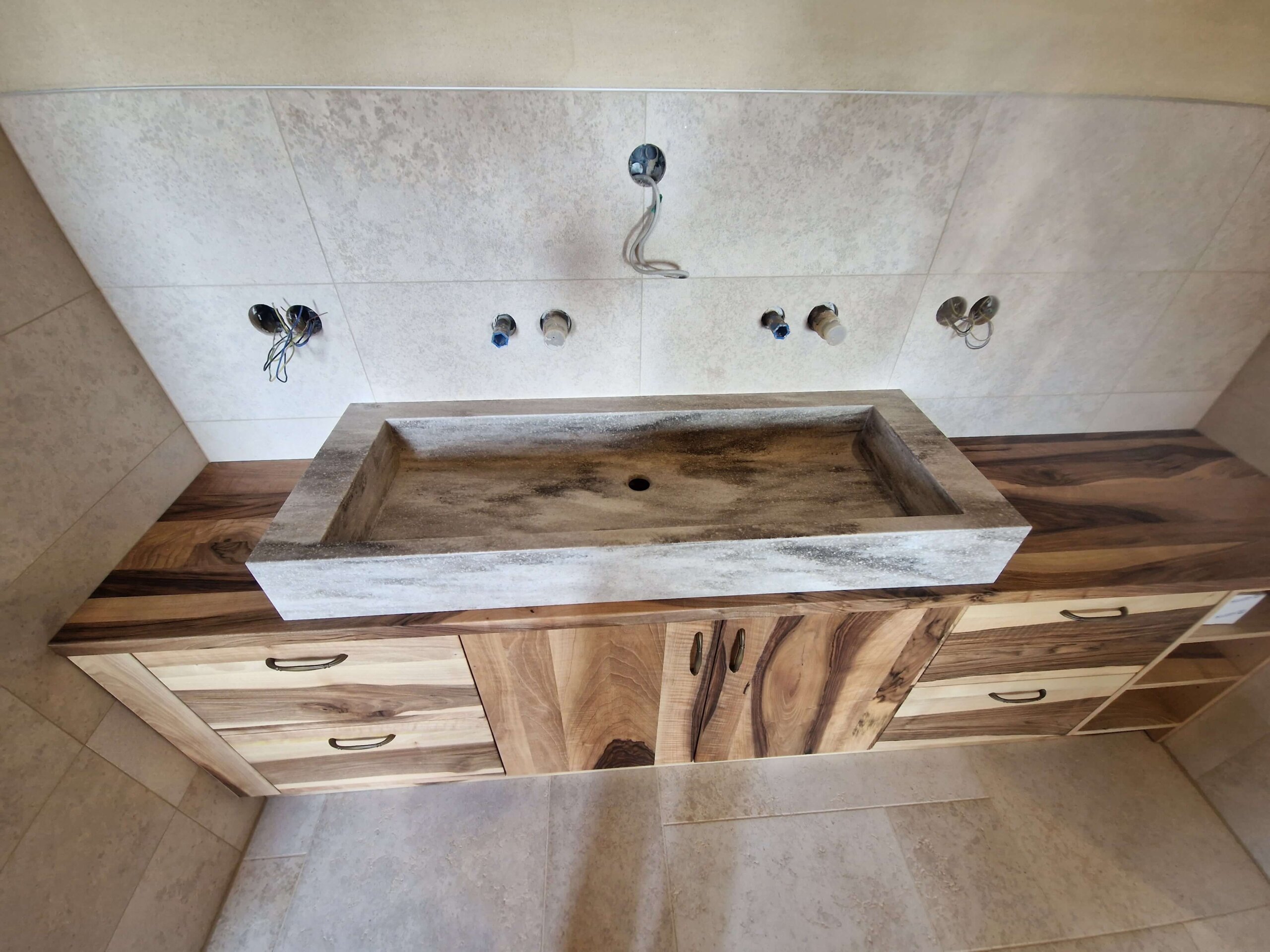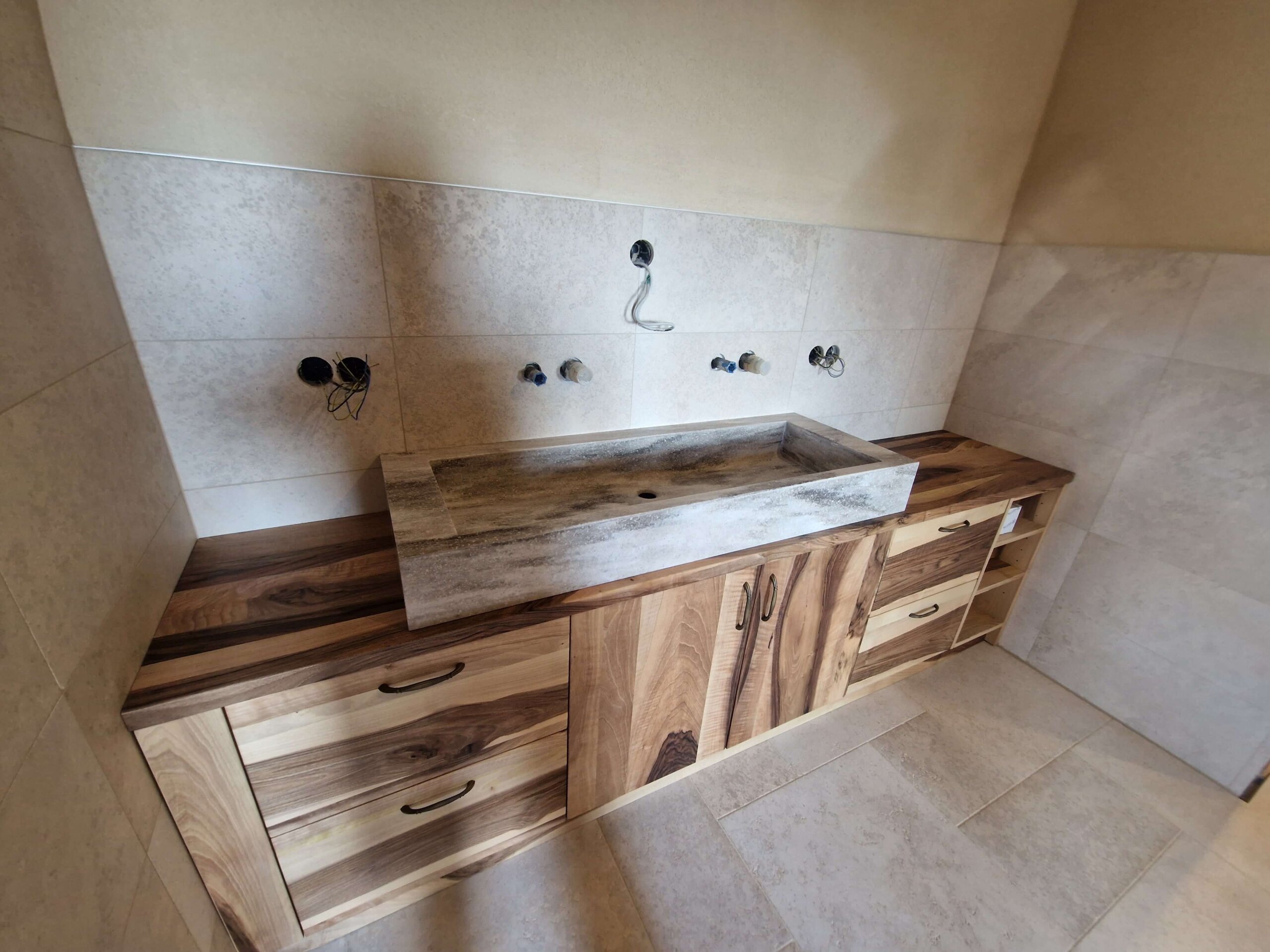 Auf Bestellung gefertigte Badezimmermöbel aus Nussholz.