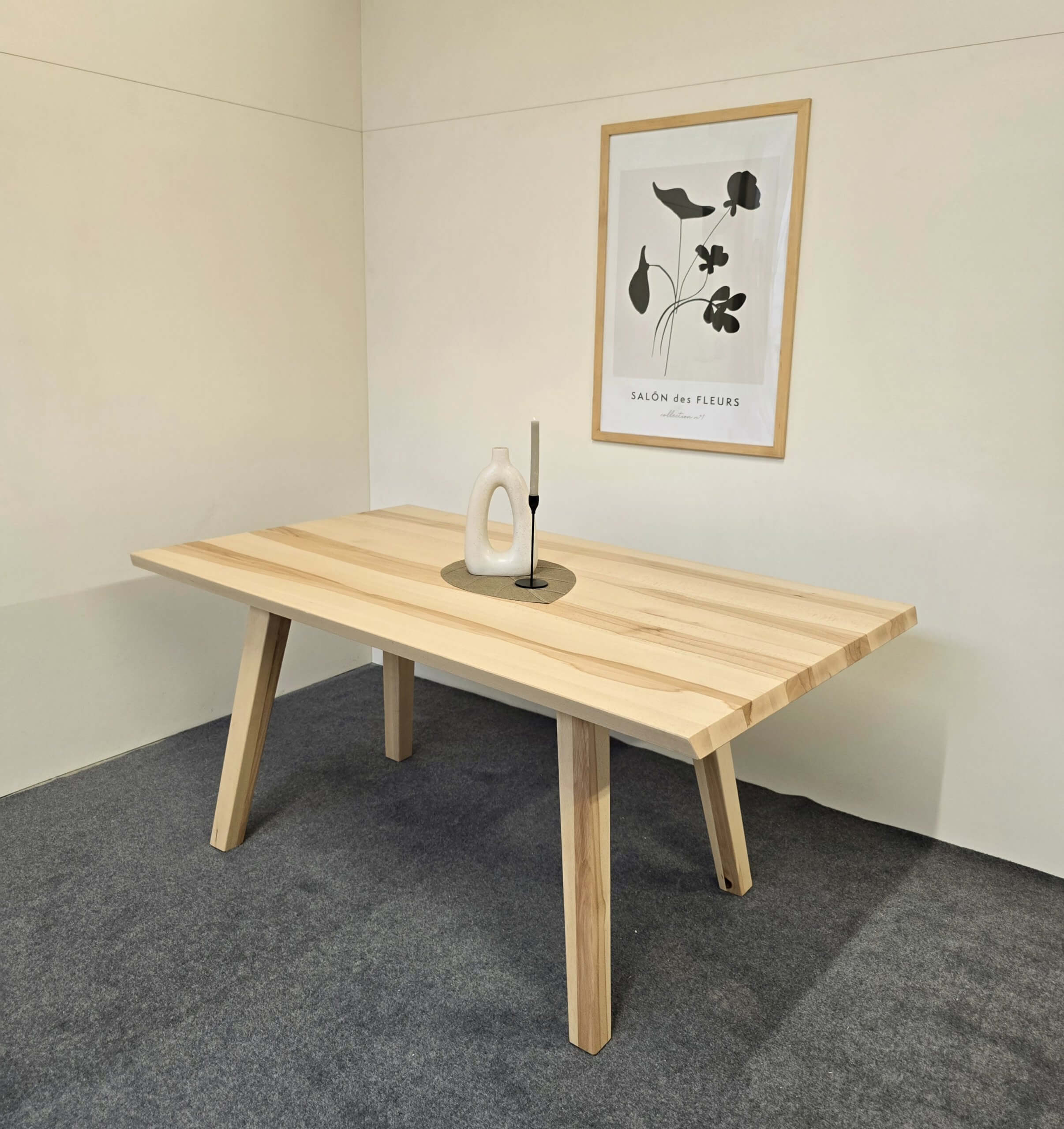 Eleganter Esstisch aus massiver Kernbuche, der die Wärme der Natur, zeitlose Form und höchste Handwerkskunst vereint. Mit dezent gefasten Kanten und klaren Linien passt er perfekt sowohl in moderne als auch in klassische Interieurs.