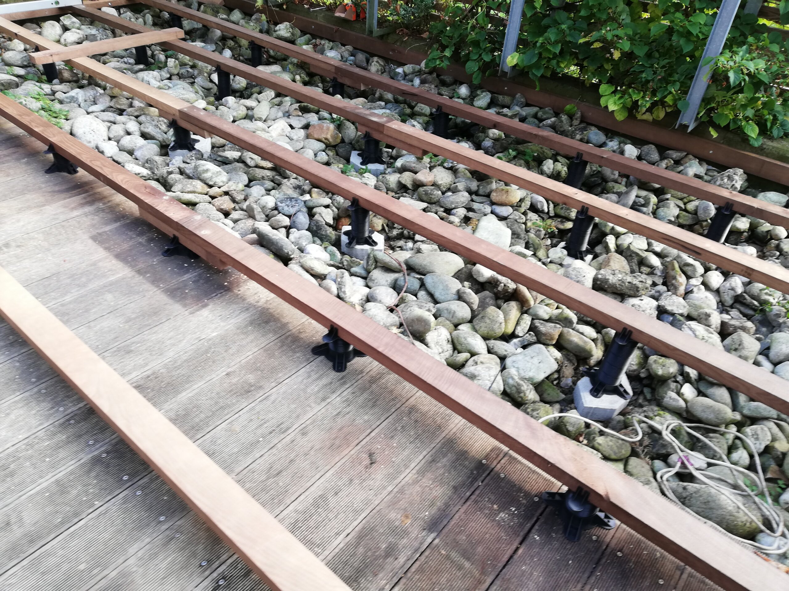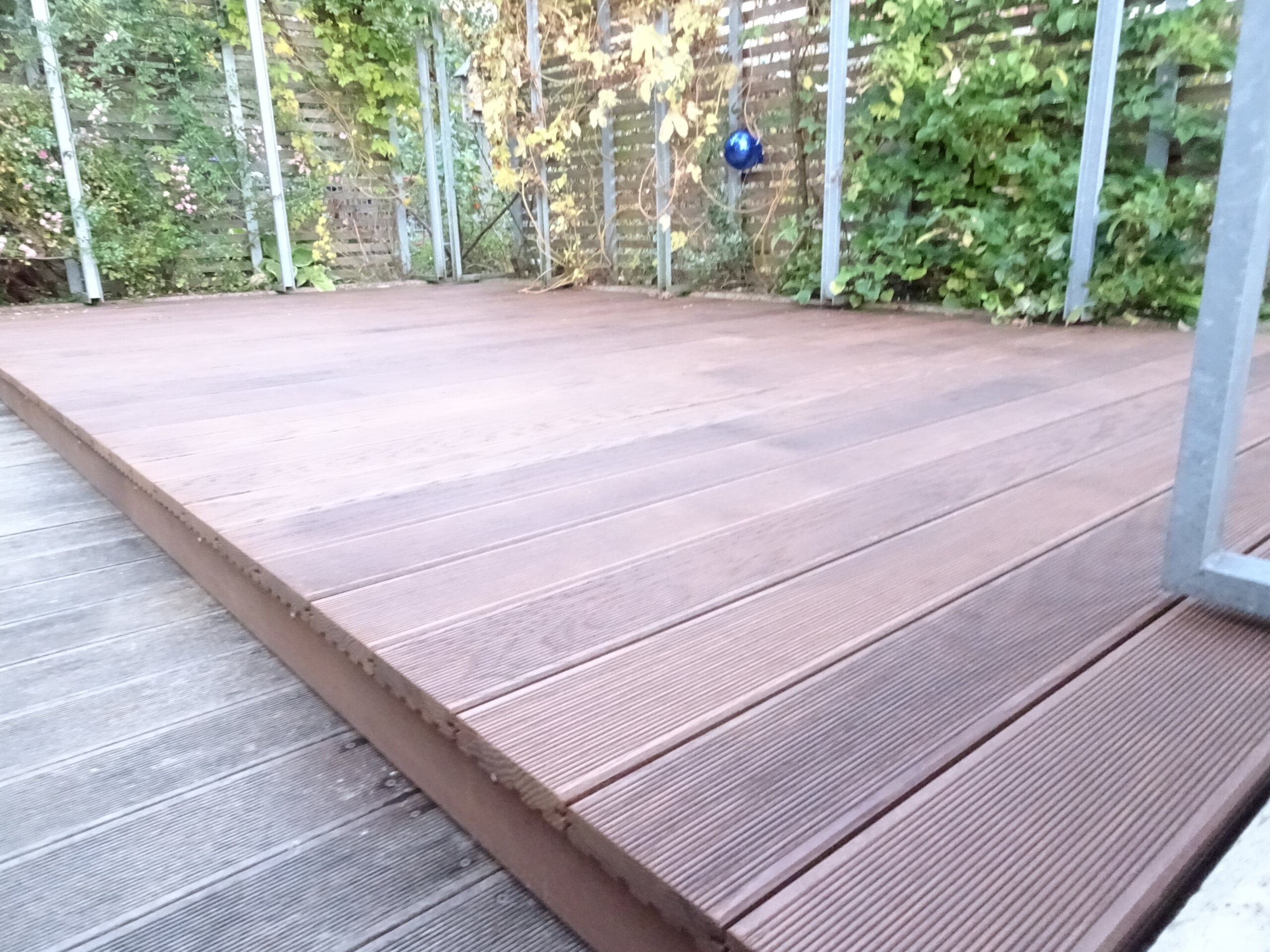 Die Terrasse ist aus Thermoespe gefertigt, was eine lange Lebensdauer gewährleistet. Das Holz verzieht sich und reißt nicht bei Regen und Sonne. Die Esche ist eine besonders harte Holzart, und durch die thermische Modifikation wird sie zu einer besseren Alternative als tropisches Holz für Terrassen.