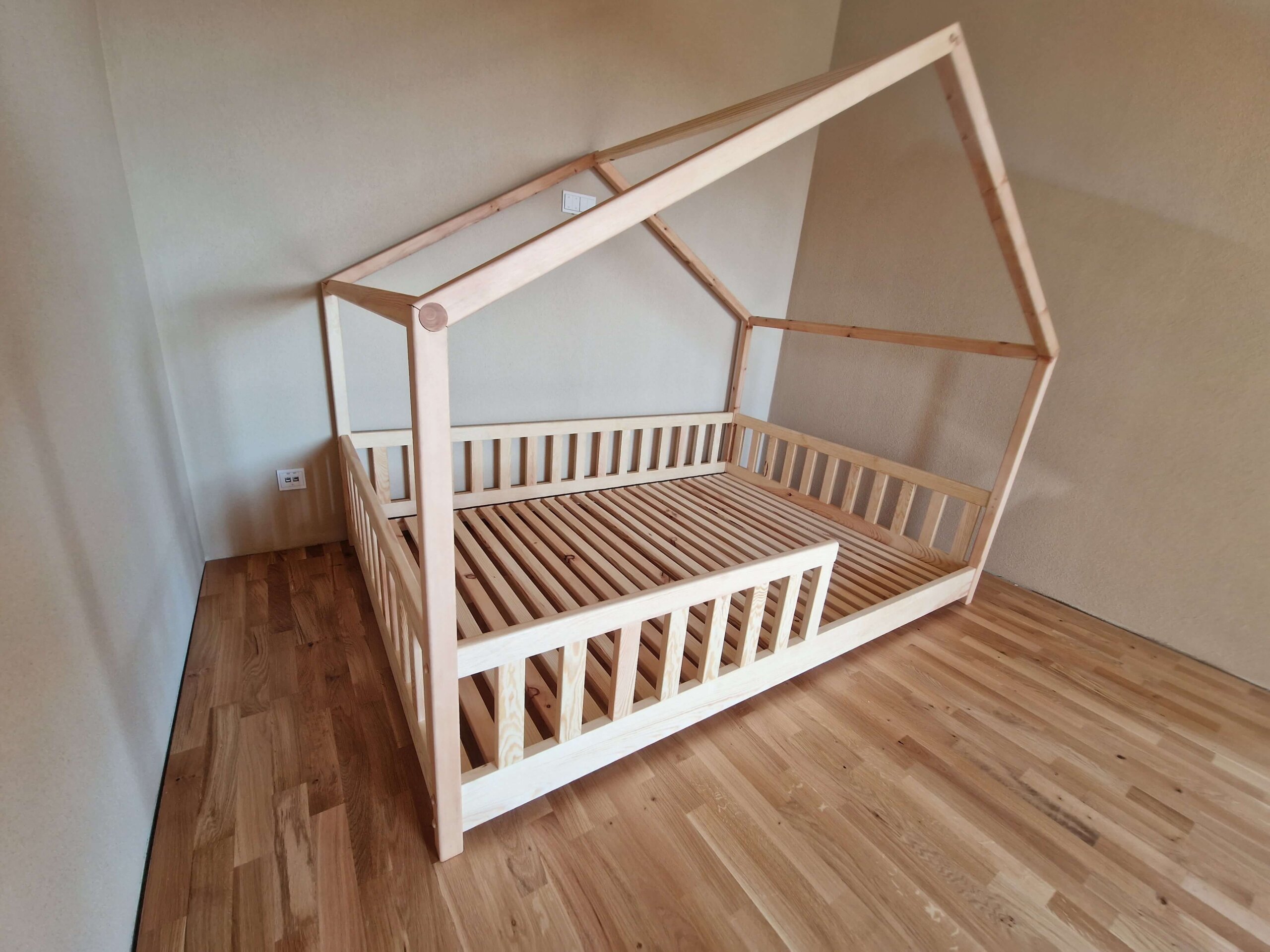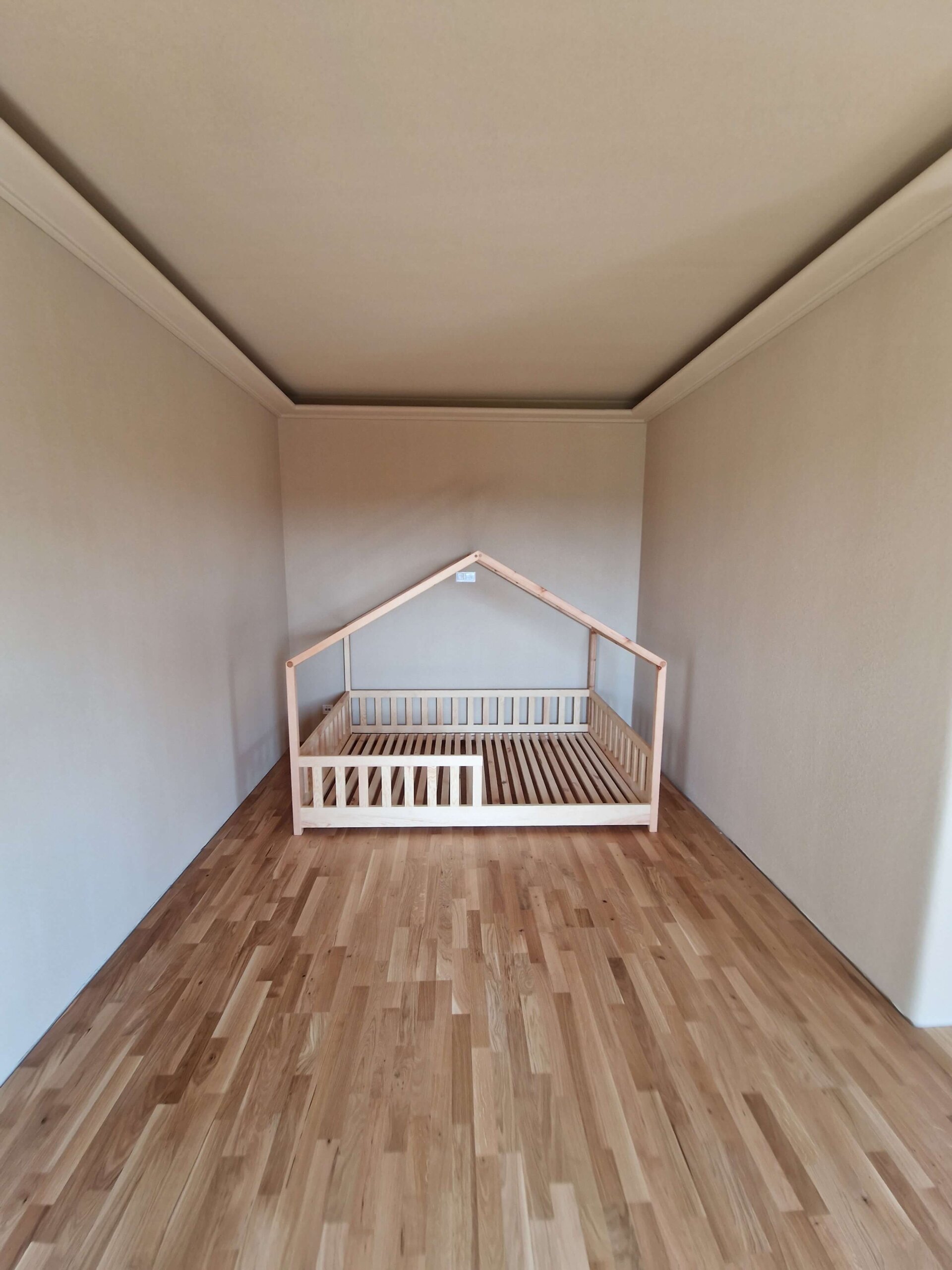 Kinderbett aus Ahornholz, in Form eines Hauses gefertigt, für einen märchenhaften Kinderschlaf.