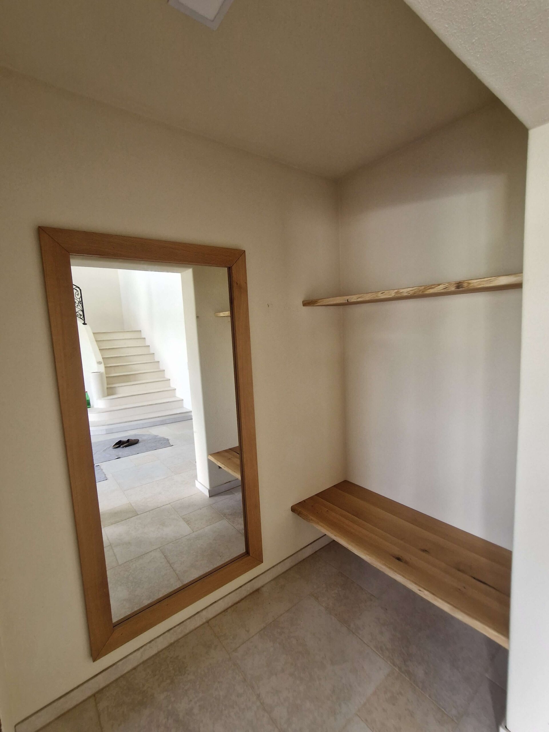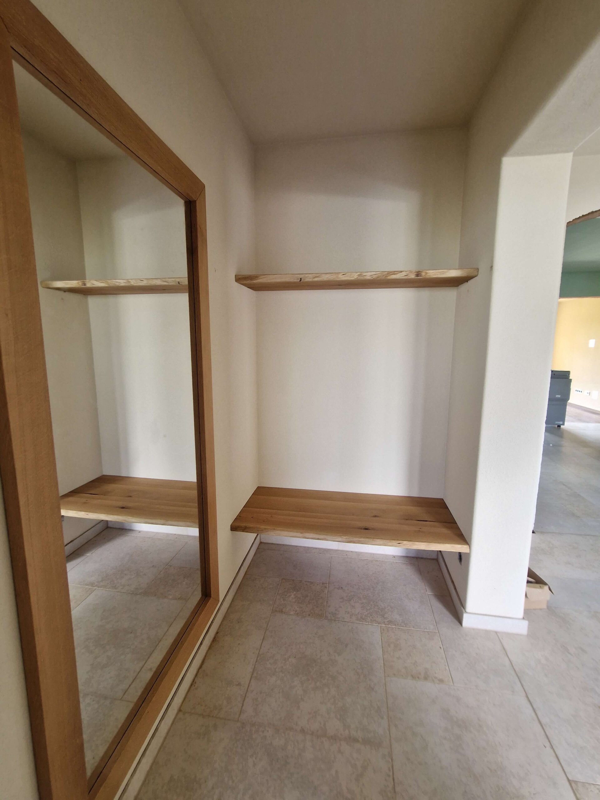 Maßgefertigter Spiegel mit Eichenrahmen sowie zusätzliche nach Maß gefertigte und montierte Regale.
