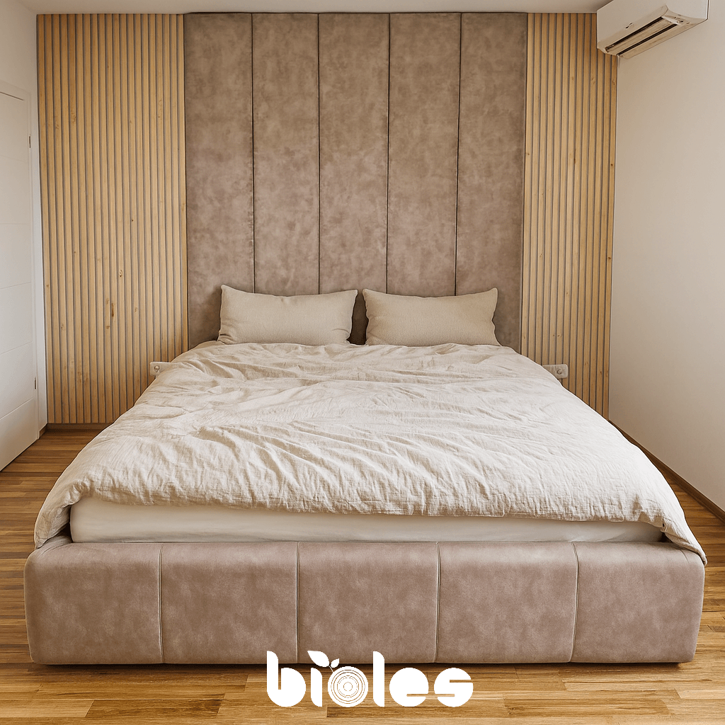 ➡️ Besonderheit – die gesamte Rückwand ist mit Paneelen gestaltet, die massive Holzlamellen und denselben Stoff wie der Bettrahmen vereinen.