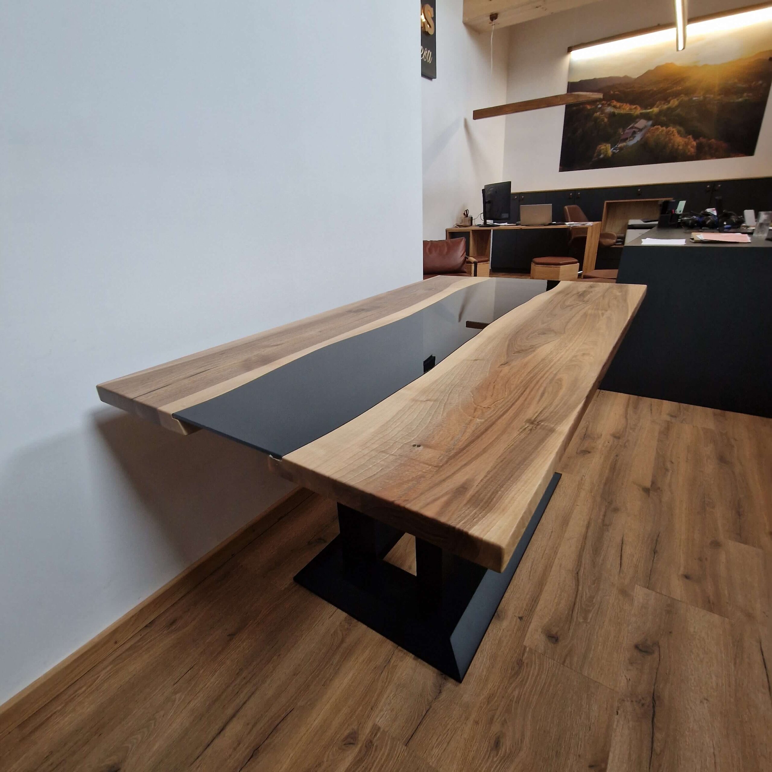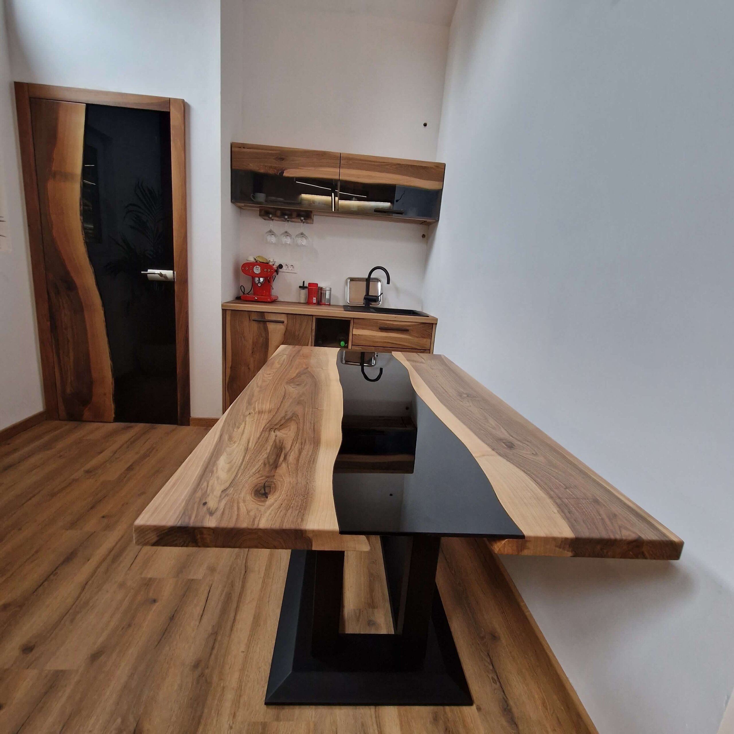 Wunderschöner Tisch mit natürlichen Kanten und dunklem getönten Glas mit den Abmessungen 180×100 cm. Der Tisch ist aus Nussbaumholz gefertigt, das Untergestell ist aus Holz und schwarz lackiert. Eingelegt ist eine schwarze 8 mm dicke getönte Glasplatte, die auch in anderen Farben erhältlich ist.